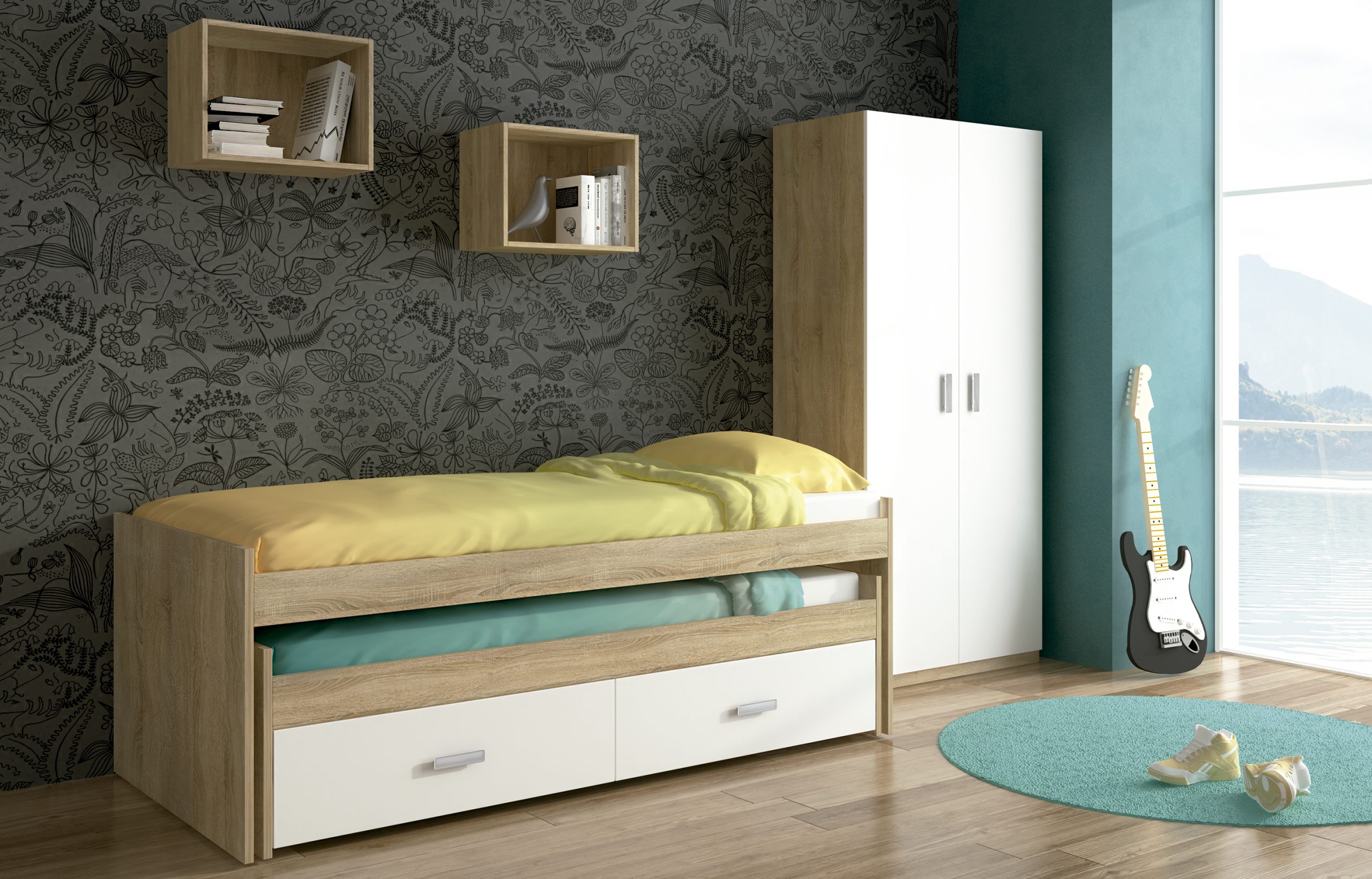 Incluye cama con opción de cajones o canapé, zona de estudio integrada y muebles auxiliares como mesita, estanterías o armario a juego. Una solución completa que aprovecha al máximo el espacio sin renunciar al diseño.