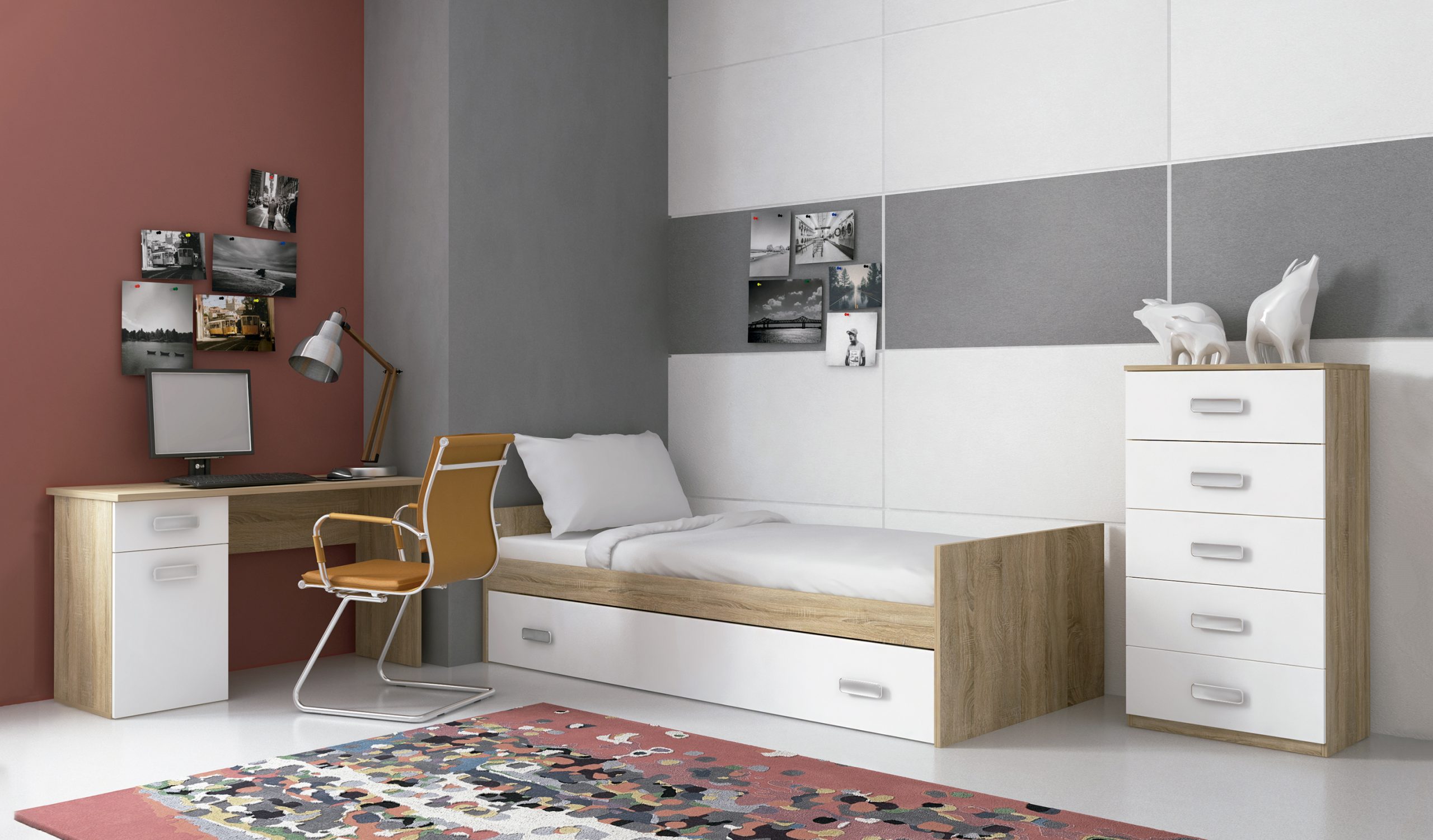 El modelo Champion está pensado para acompañar a los más jóvenes en su día a día, combinando estilo, comodidad y funcionalidad en un espacio que inspira creatividad y orden. Su diseño moderno, con líneas rectas y contrastes de color, lo convierte en una opción ideal para adolescentes y jóvenes que buscan un dormitorio con carácter propio.